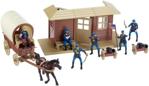 When ever you watch a western film, more often than not a Wooden Fort pops up! No you can own your own Wild West Fort Playset! this incredible Value for money playset includes the a replica wooden fort that measures 68cm x 58cm when built up, and includes an array of soldiers in different posses, flages, a couple of cannons- the set even includes a classic western style horse and wagon! Recommended For Ages 3 Plus